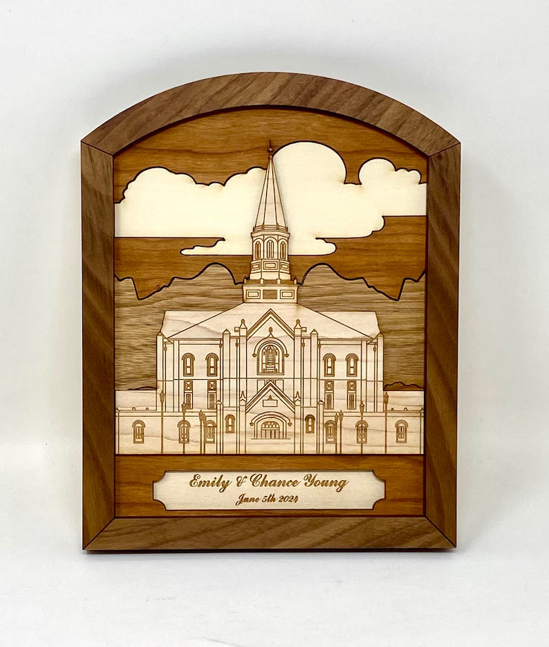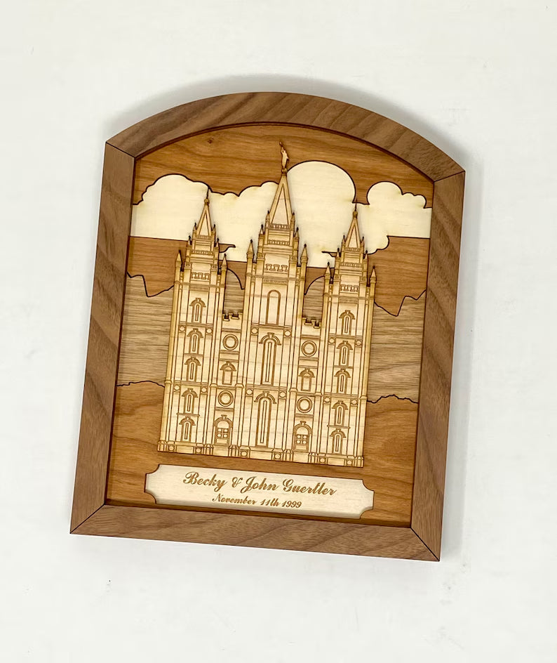 Each plaque features a temple rendered in bright maple, framed by rich layers of walnut, aspen, cherry, red cedar, and butternut woods. The arched shape evokes reverence and timeless tradition, while the multi-tone layering creates depth, warmth, and elegance.