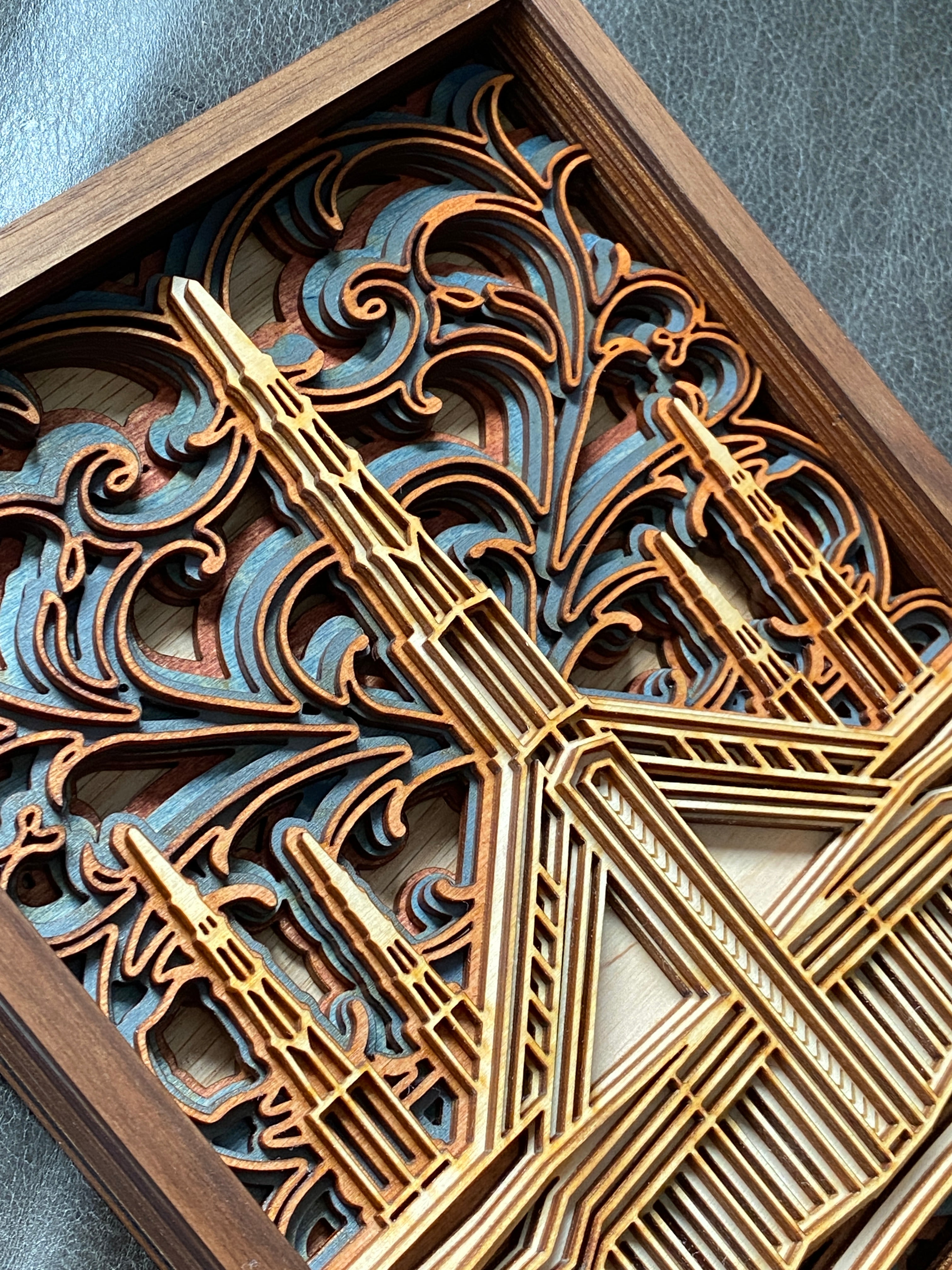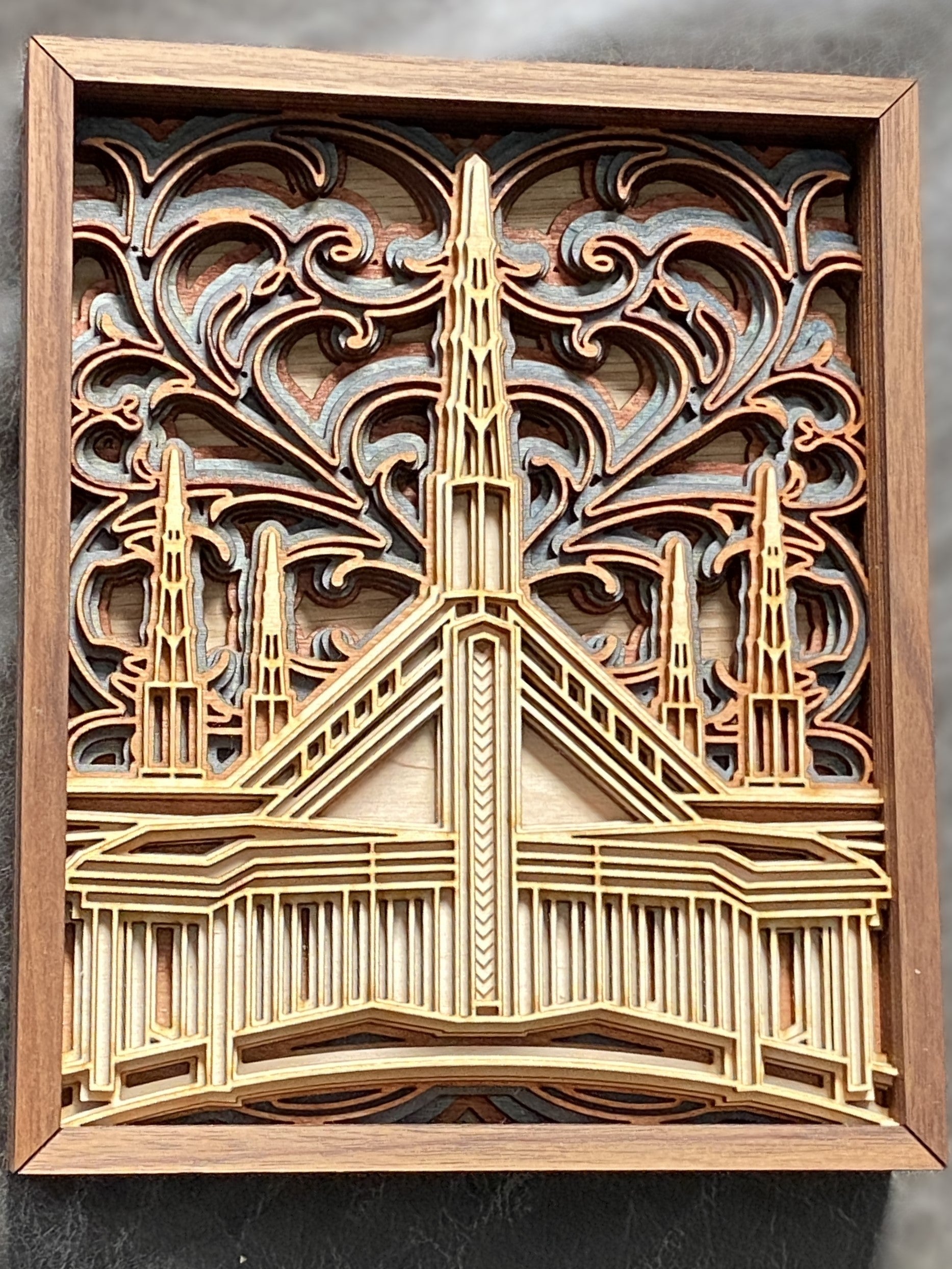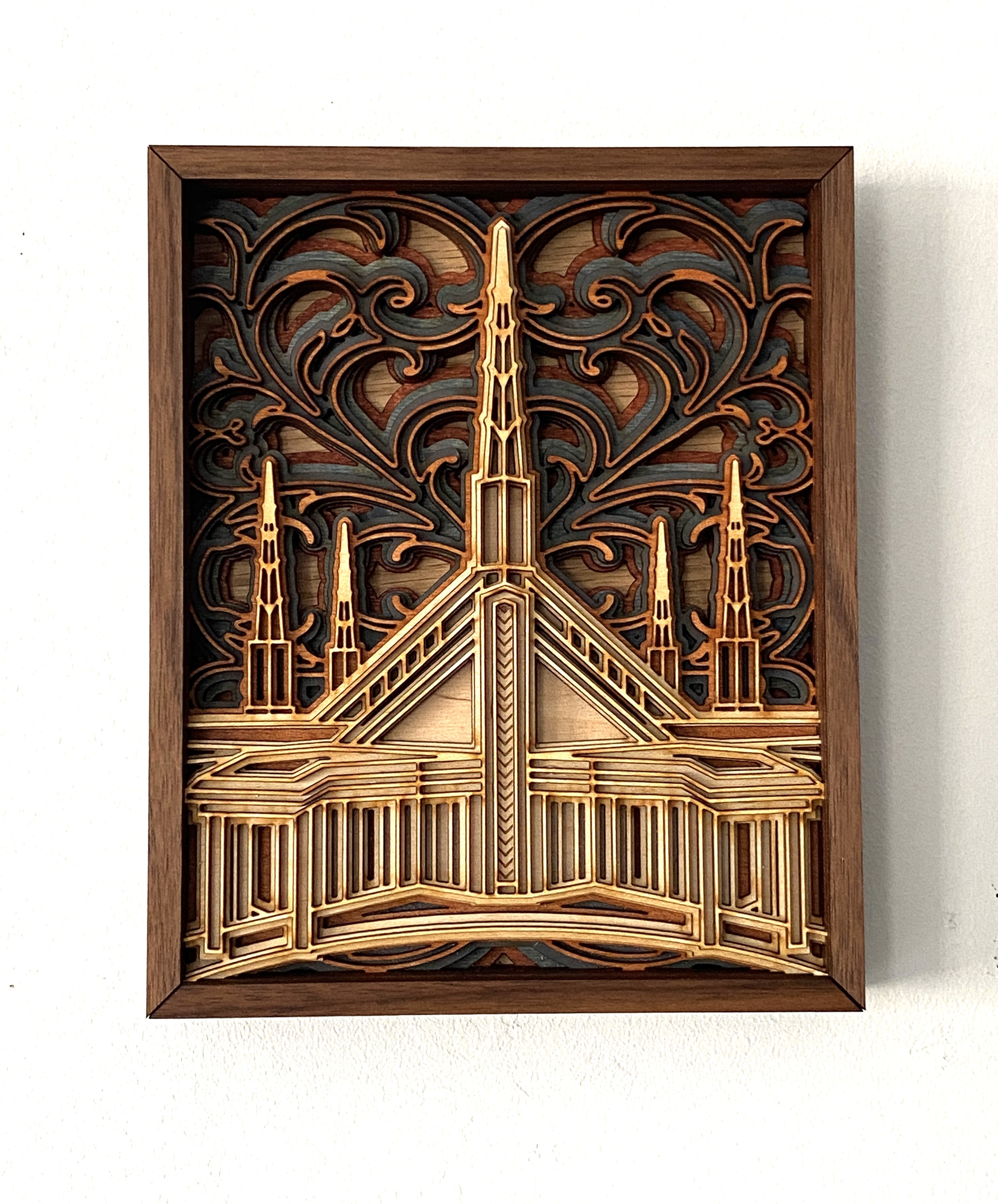 This multi-layer "mandala style" temple plaque is an original design. This detailed art piece is created out of 9 layers of laser-cut birch and stained birch, including navy stained birch, as well as mahogany and red oak woods. The background design is inspired by the stained glass windows of the building.